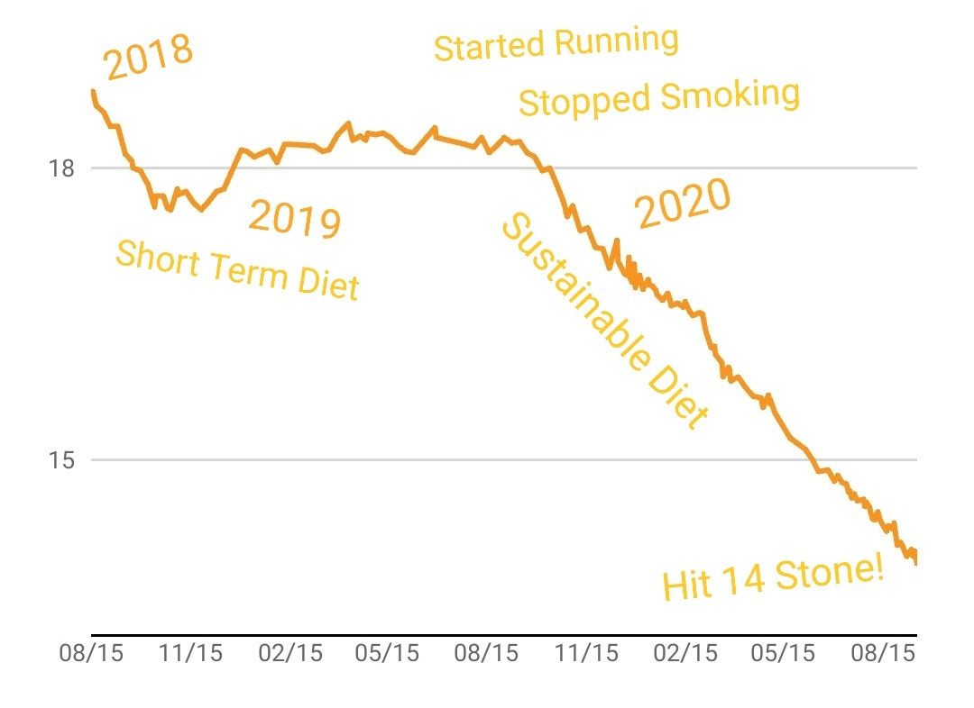 At this point I'd given up smoking, was running consistently, and my weight chart did this: