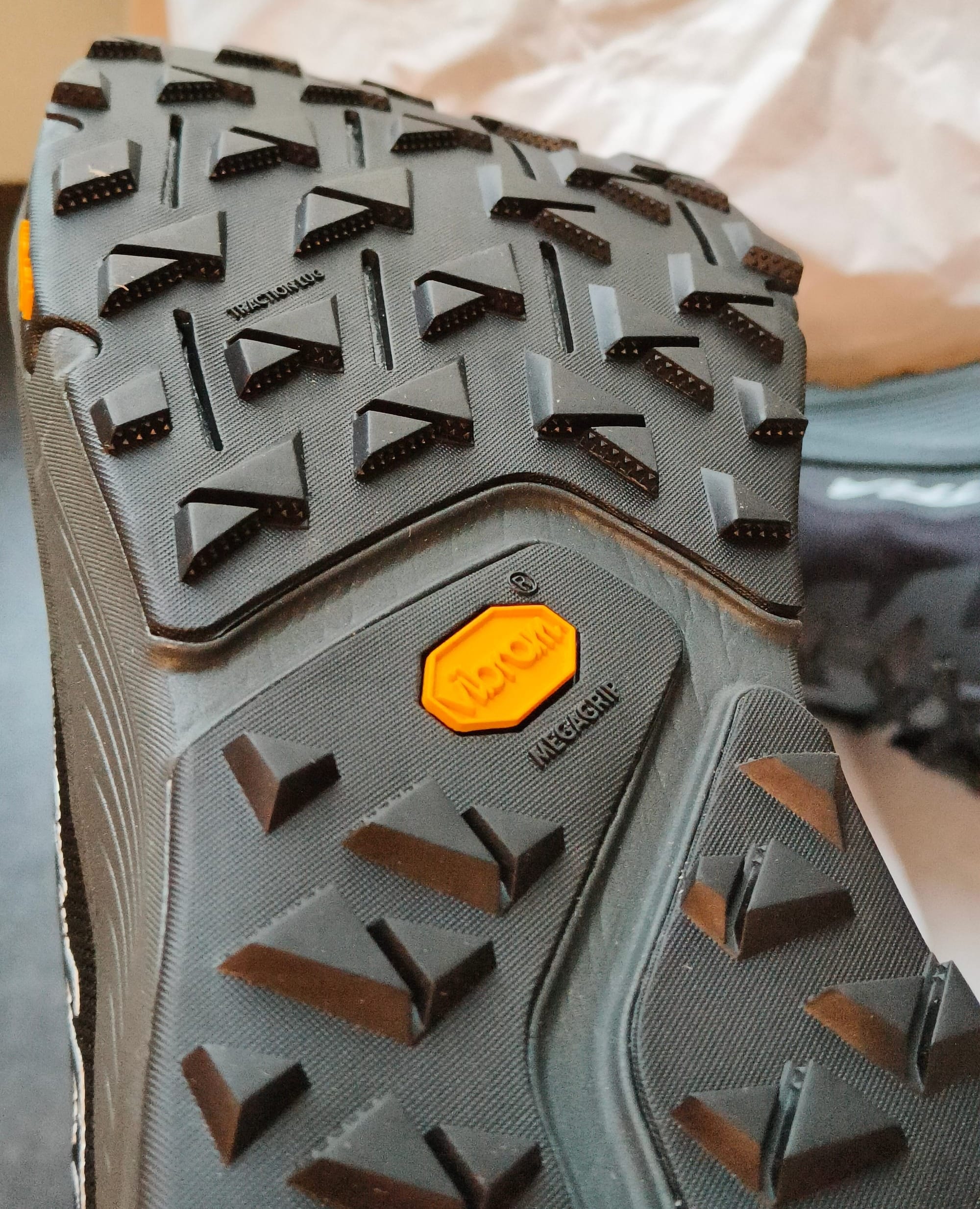 - Outsole is ~3.5mm of Vibram Megagrip with Traction Lugs (those little nobbly bits on the lugs that the Hoka Speedgoats and Merrell Agility Peaks use)