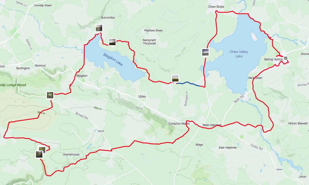 The route was around Chew Valley; inspired by a back and forth with a colleague on Strava Route Planner, ending up with a tour that hit both lakes, the beacon and Charterhouse, looking like this: