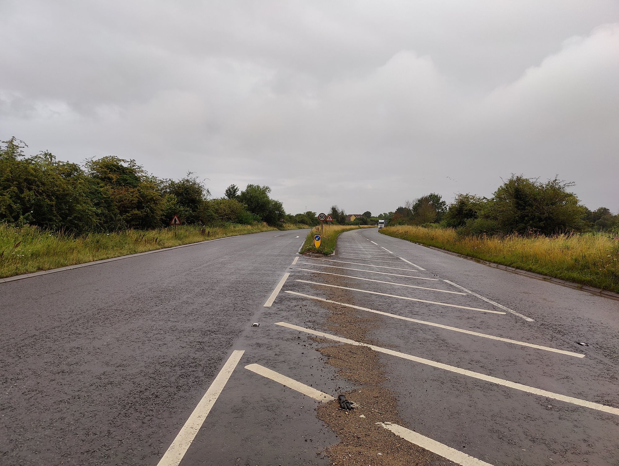 Took a long detour back to the A road, to find that for the most part it had no pedestrian pathways. As seen in this pic, there are only grassy verges.