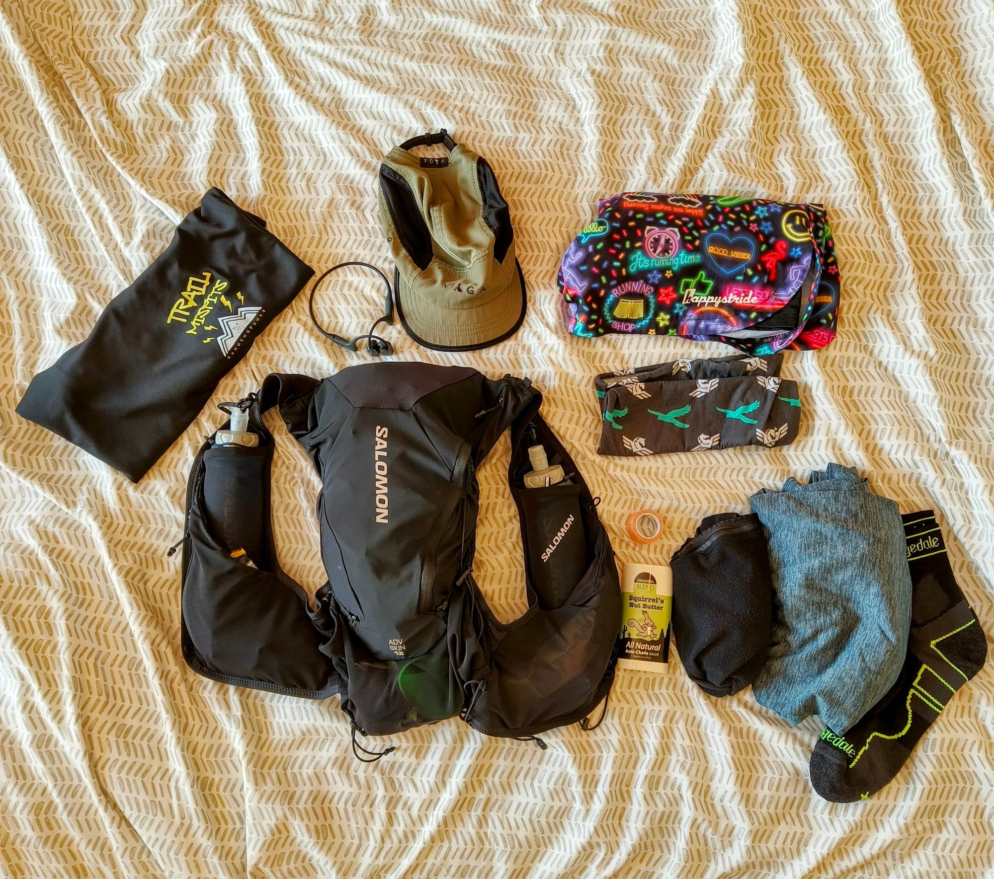 Pretty standard kit now on my back: Happy Strides shorts (the neon ones), a Running Punks top, Vaga cap, Salomon Adv Skin 12 pack, Squirrels Nut Butter for anti chafing, a light old Under Armour top with some Castelli Arm Warmers to keep the chill off, and Shokz OpenRun Pro headphones to keep me sane.