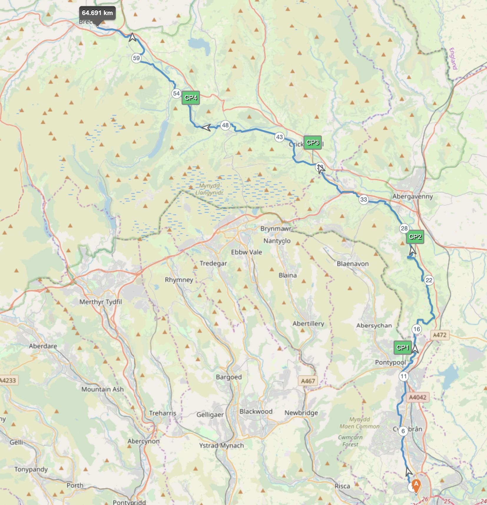 Kept the pace up at around 05:20-05:30/km until CP2, it felt fairly sustainable at the time. The views opened up on this stretch as you ran with the Black mountains to your right, a beautiful sight.