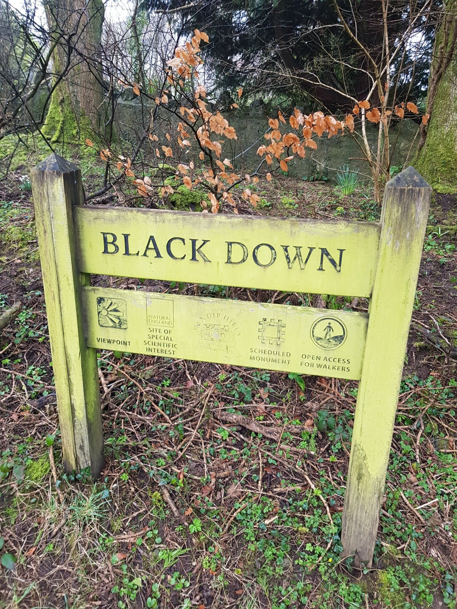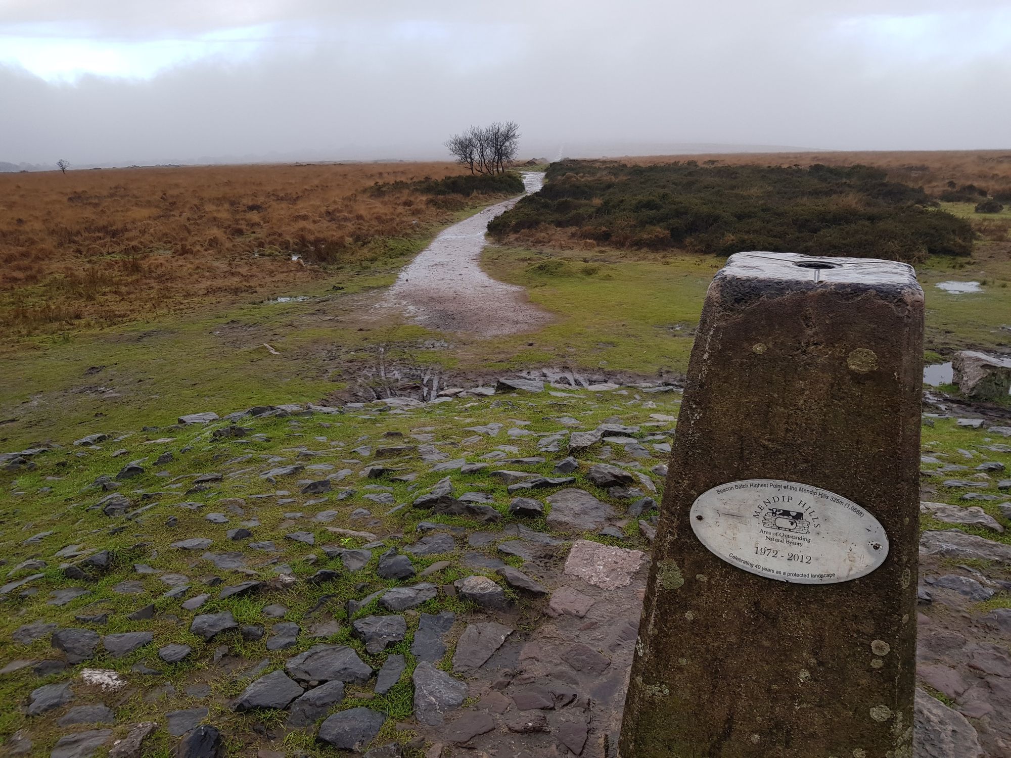 Here's the bit where it tests you; from Blagdon Lake to the top of Black Down (the highest point in the Mendips) is an almost 300 meter climb, starting with a steep section through the village, then a flat farm track leading to trails and this sign post.