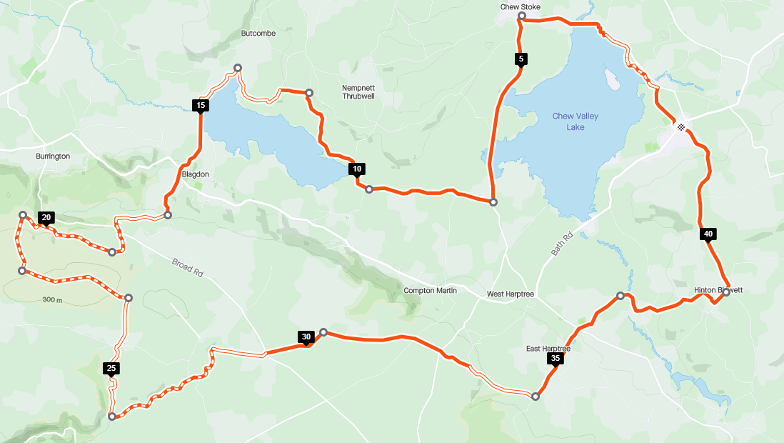 Starting in Bishop Sutton, the route goes north along the eastern side of Chew Valley lake, through the light trails along the water, before crossing the bridge at the top of the lake into Chew Stoke Village