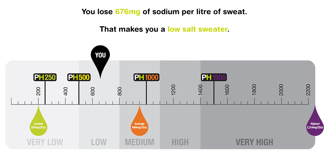 My results came in at a sodium loss of 676mg per litre of sweat, which means I should be aiming to take 338mg for every 500ml water. Knowing the exact figure helps, as I can then work out whether I've been taking too much, or too little salt.