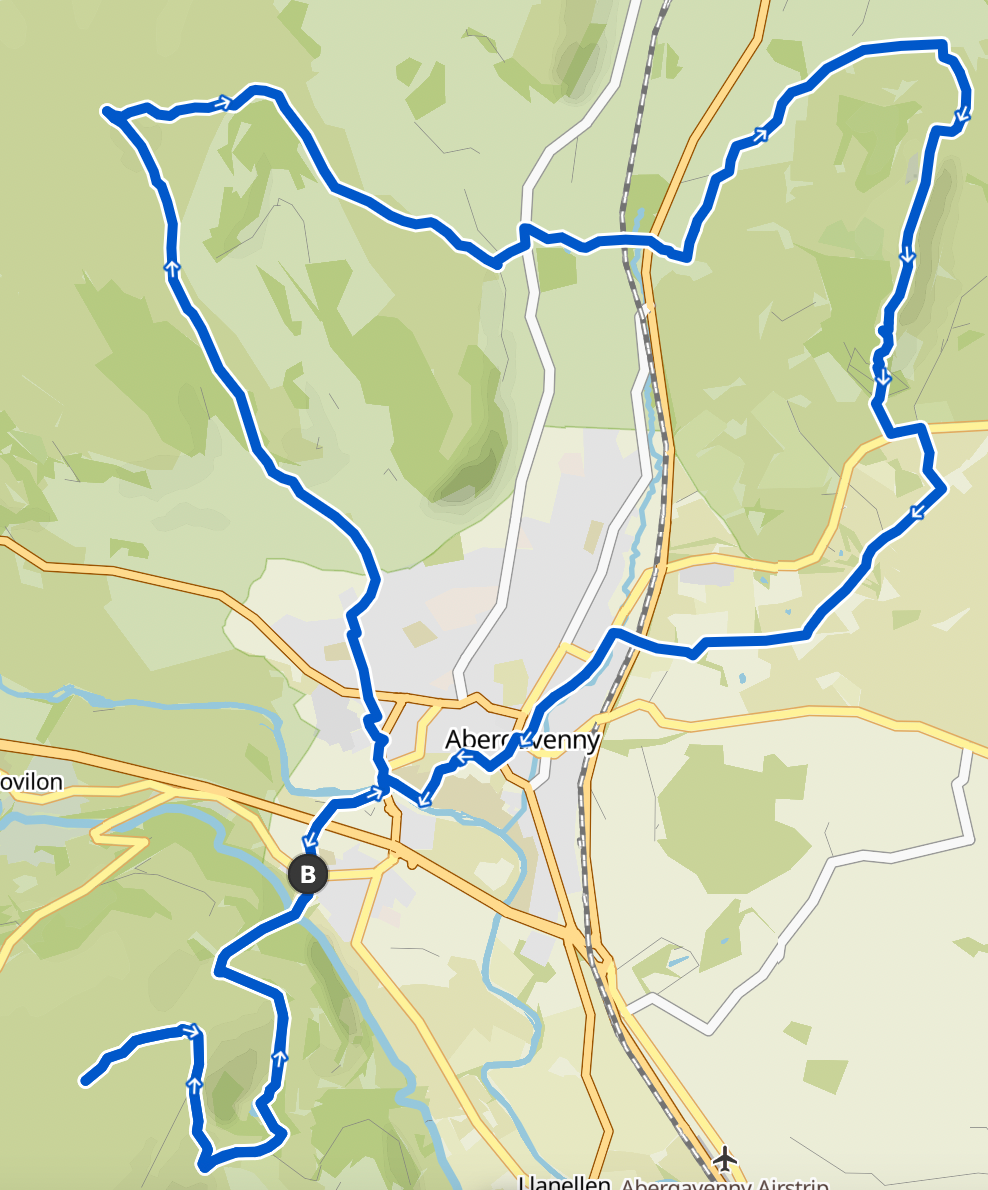 It contains 5,400 meters elevation gain over 23 mountains, namely Sugar Loaf, Skirrid Fawr, The Blorenge, Gilwern Hill, Blaen Onneu, Mynydd Llangynidr, Pant y Creigiau, Bryn Melyn, Tor y Foel, Table Mountain, Pen Cerrig Calch, Pen Allt Mawr, Pen Tywn Glas, Mynydd Llysiau, Pen Trumau, Waun Fach, Pen Y Gadair Fawr, Rhos Dirion, Twmpa, Hay Bluff, Twyn Llech, Black Mountain, Sugar Loaf for a second time (because why not!)