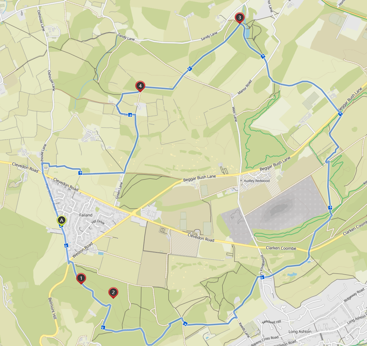 It starts on Flax Bourton Road, where there is always plenty of places to park your car, then proceeds into the Ashton Plantation woodland for a downhill stretch to the fields east of the woods.
