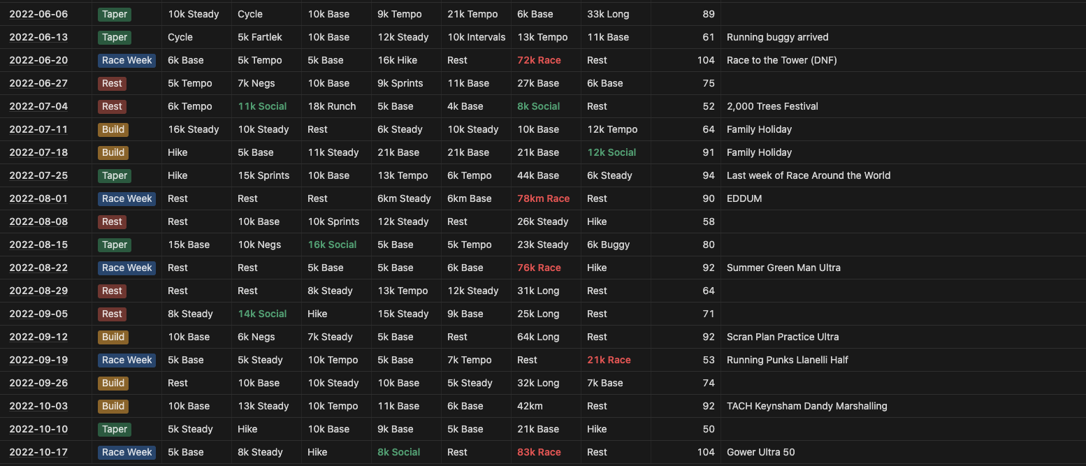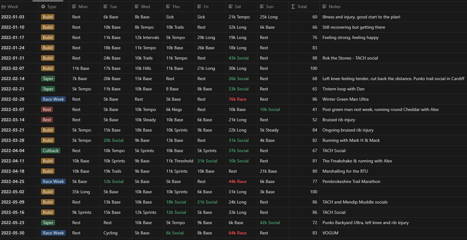 Just in case it helps anyone, my own training for 2022 looked like this: