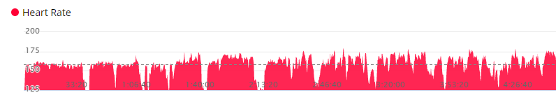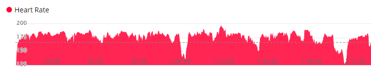 Heart rate stays predominantly under 175, raising over time as the distance clocks up, which is to be expected.