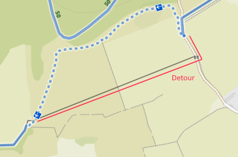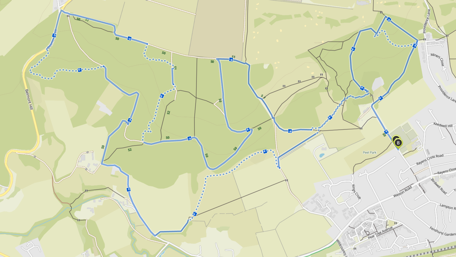 Note: you may need to deviate from the GPX file here, the route through the field seems to have been replanned so it doesn't hug the edge of the woods, as highlighted below: