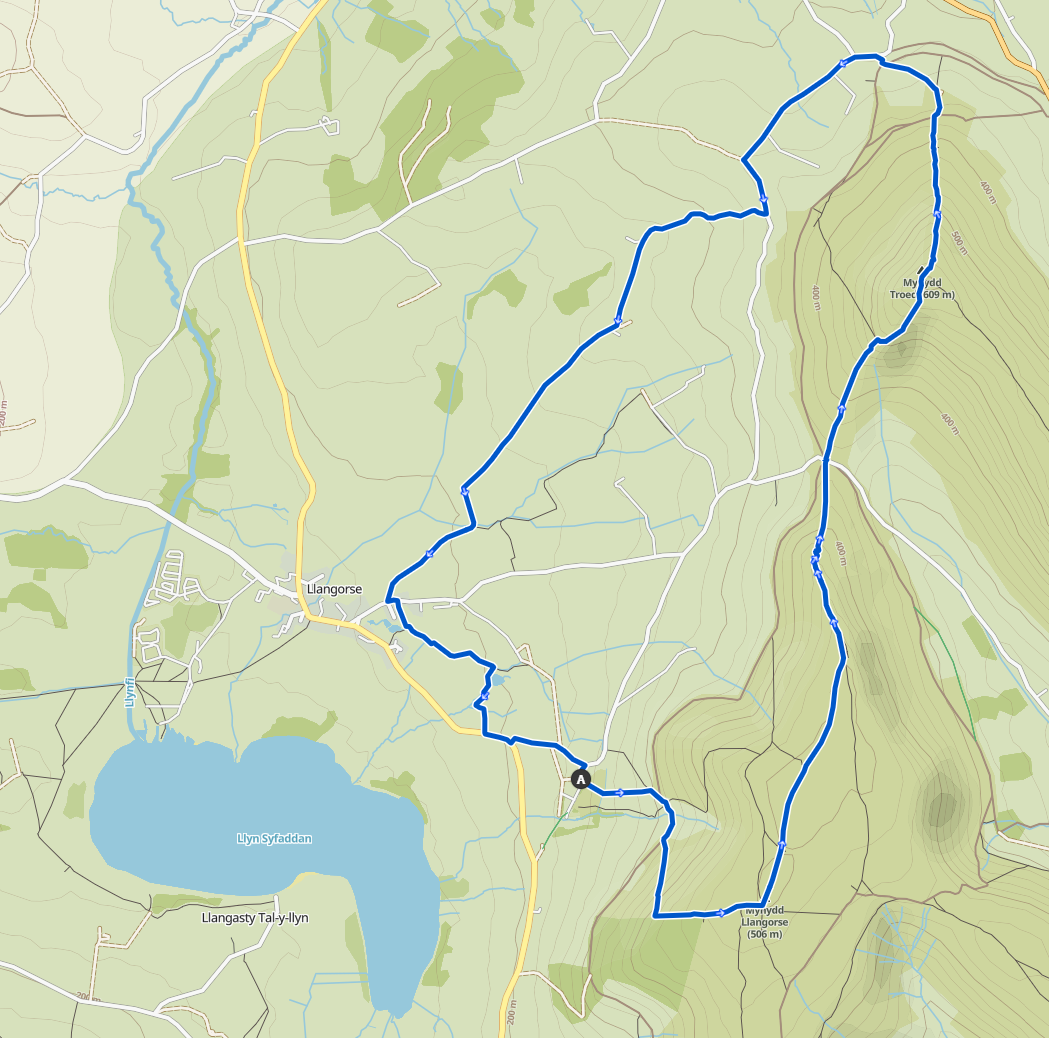 At the bottom is a long steady stretch along country lanes back towards Llangorse village where you can see the peaks from a different angle.