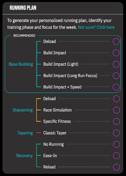 It allows you to select your focus for the next week from a series of options, then tweak the days each workout lands on to your own schedule.