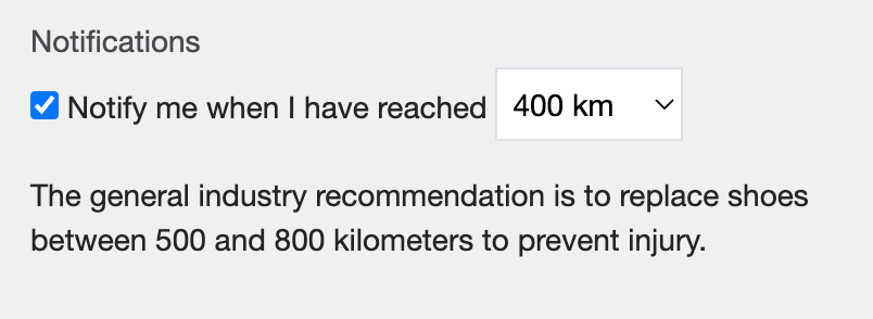When adding shoes to Strava it comes with this feature and message encouraging you to swap out shoes when they've reached 500-800km. On the website the default reminder is sent at 400km.