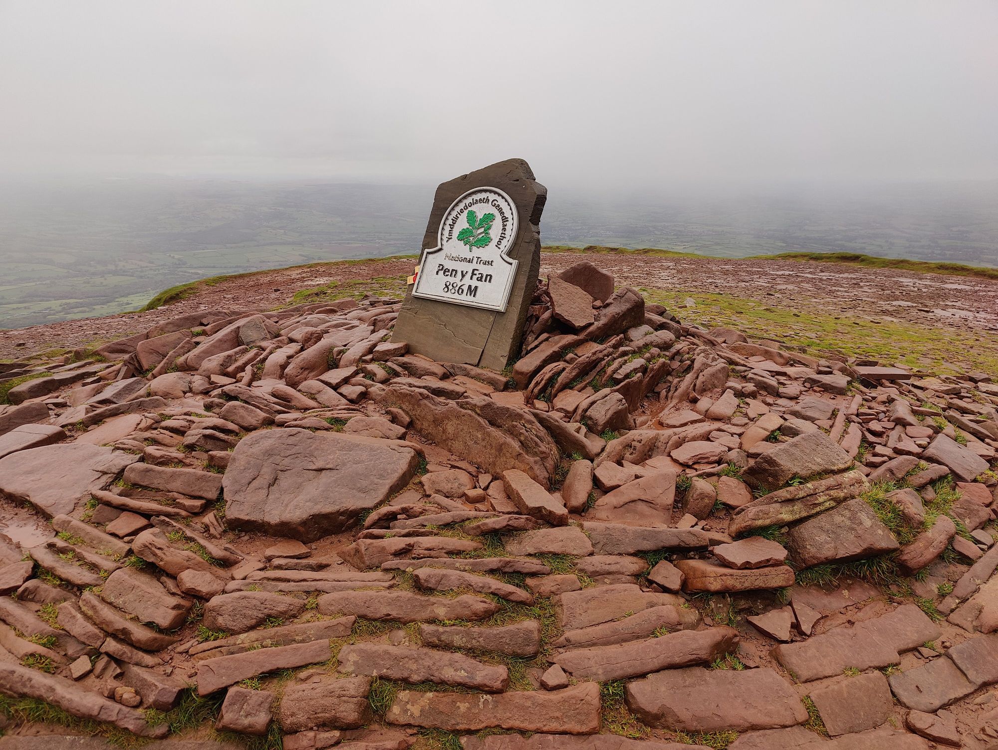 From here it's another descent through a valley between the peaks, before a more manageable scramble up onto Pen y Fan along the less travelled south-east path, over big rocks surrounding the summit.