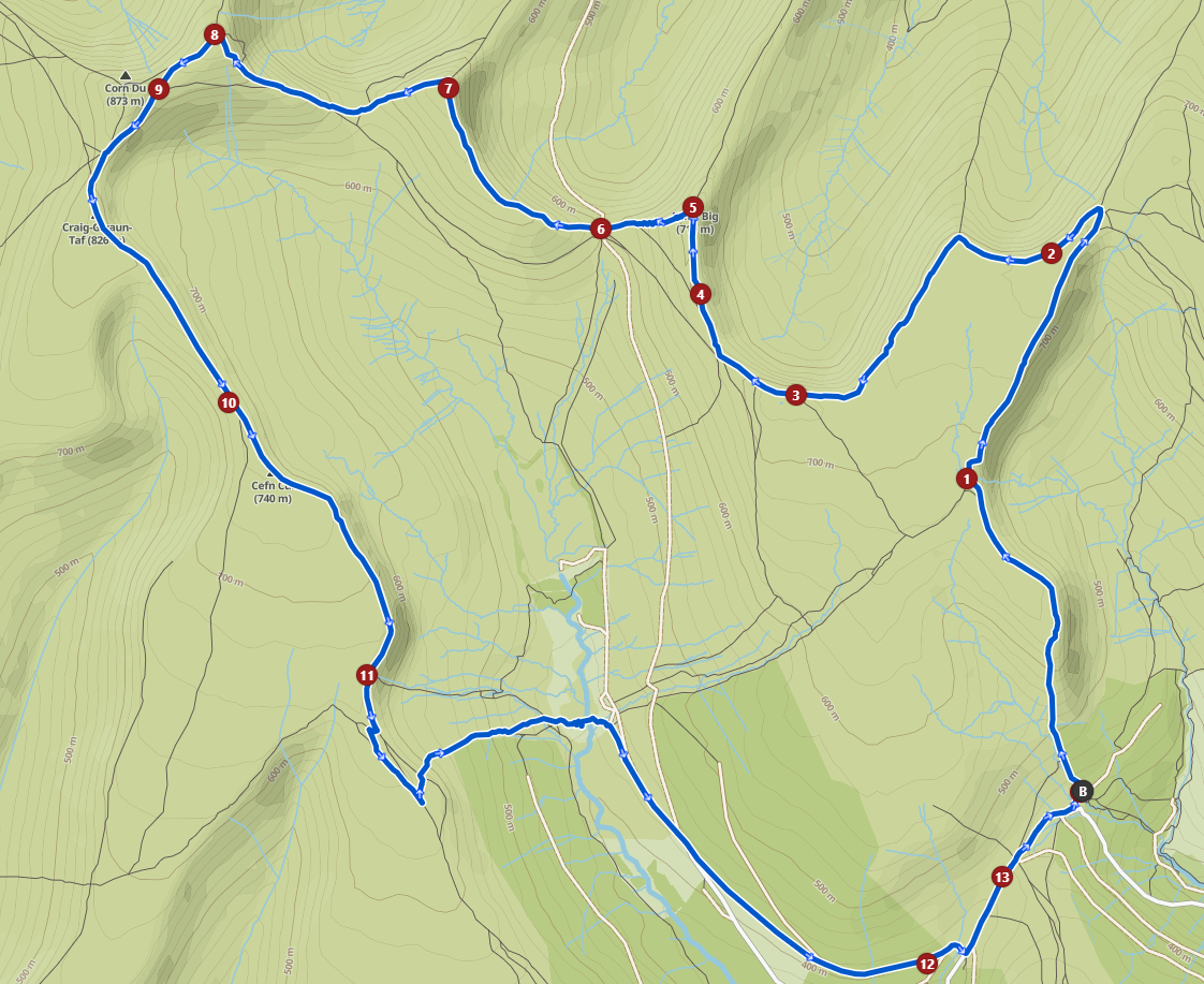 Note: on my GPS route I don't hit Corn Du, another peak next to Pen y Fan at 873m, however it's so close and not a huge climb so I'd recommend going for it. I regret not doing it!