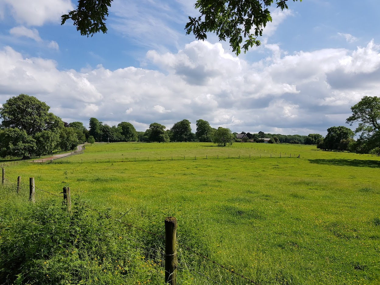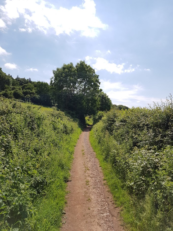 At the top there's a set of fields, leading off to the right over one of them back towards the country lanes.