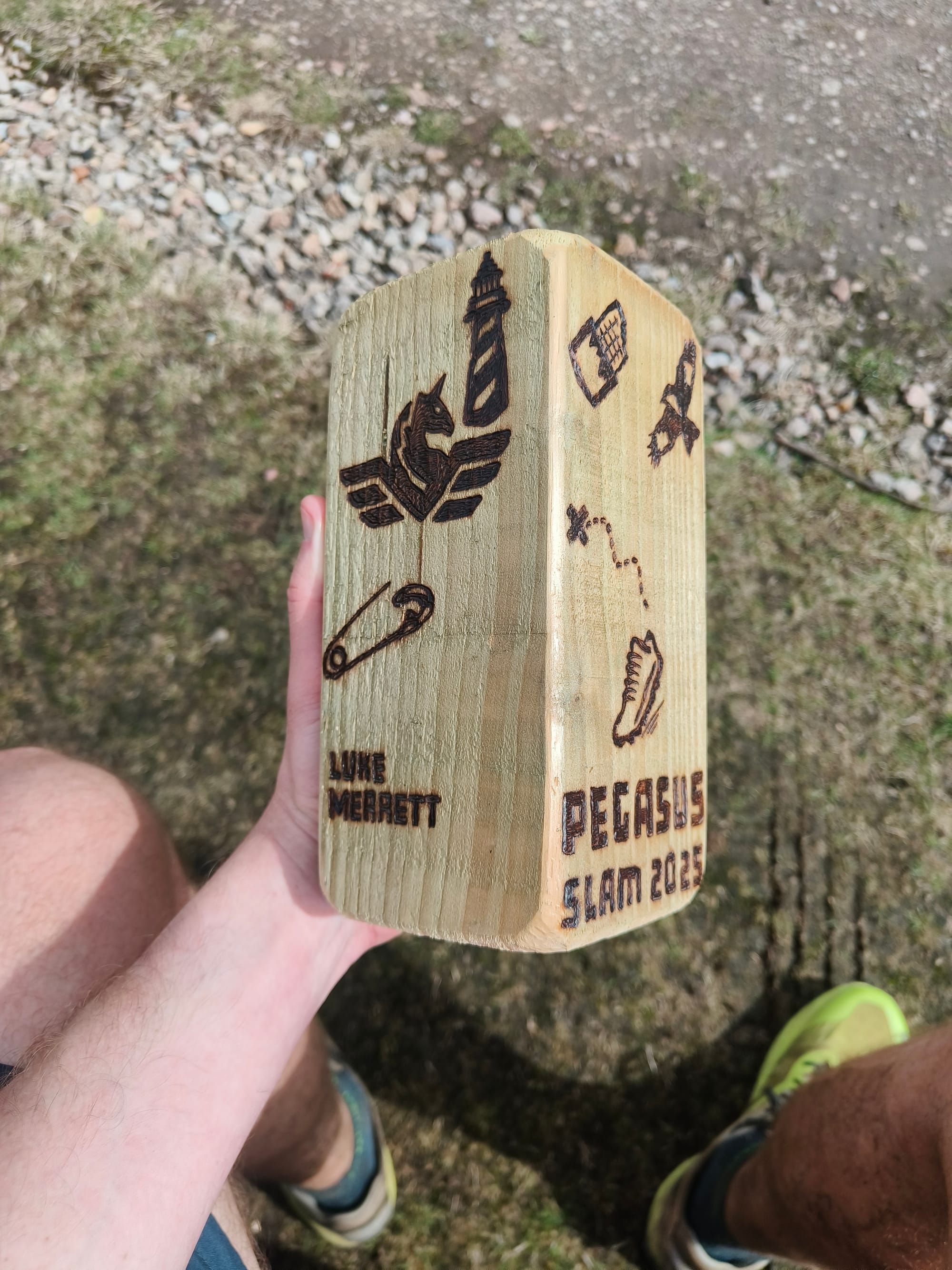 After being given the RIDUM medal by the lovely SheRun's folk, Owain handed me a Pegasus Slam t-shirt and the most coveted thing of all: a Pegasus Slam trophy, hand burned and personalised.