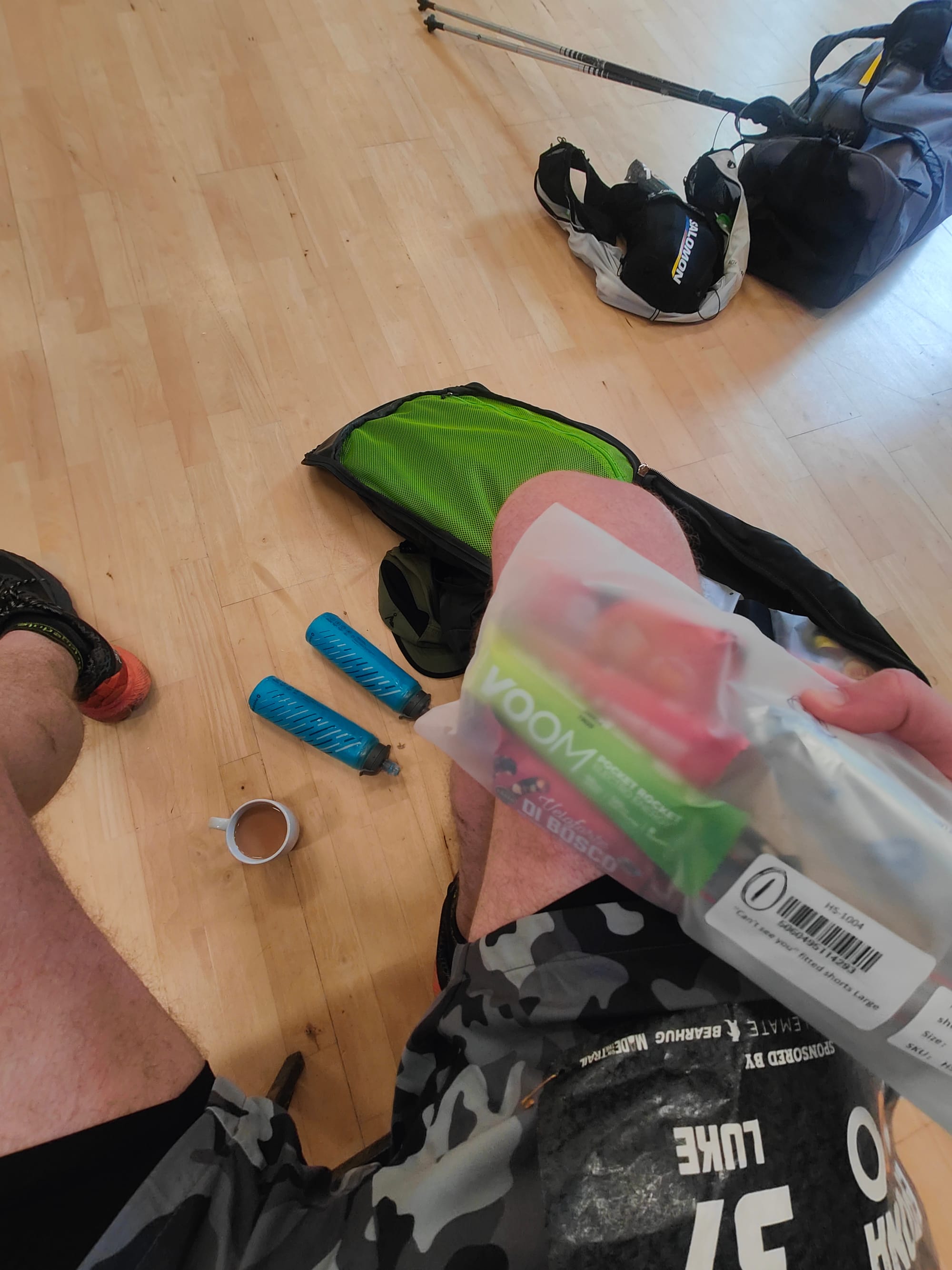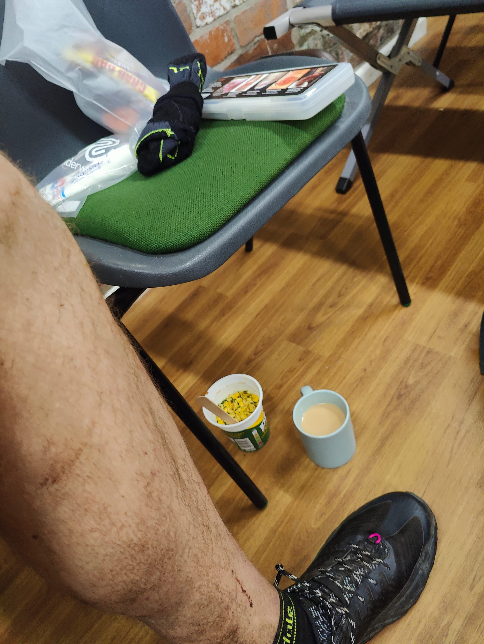 Did a lot of admin here: ended up putting three dressings on my feet alongside taping some smaller patches, changing my socks, reapplying anti-chafe and having a cuppa with a pot noodle.