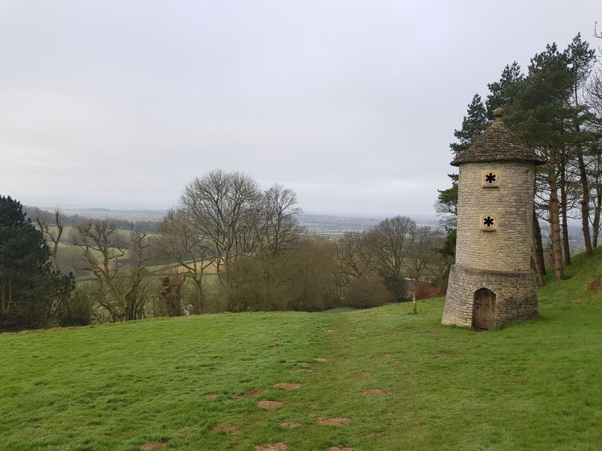 Then after another section of lanes and sheep populated fields, it's on to the Horton Camp climb. The effort to get up the hill is rewarded with a visit to the Millennium Folly Owlery tower and great views from the 205m viewpoint