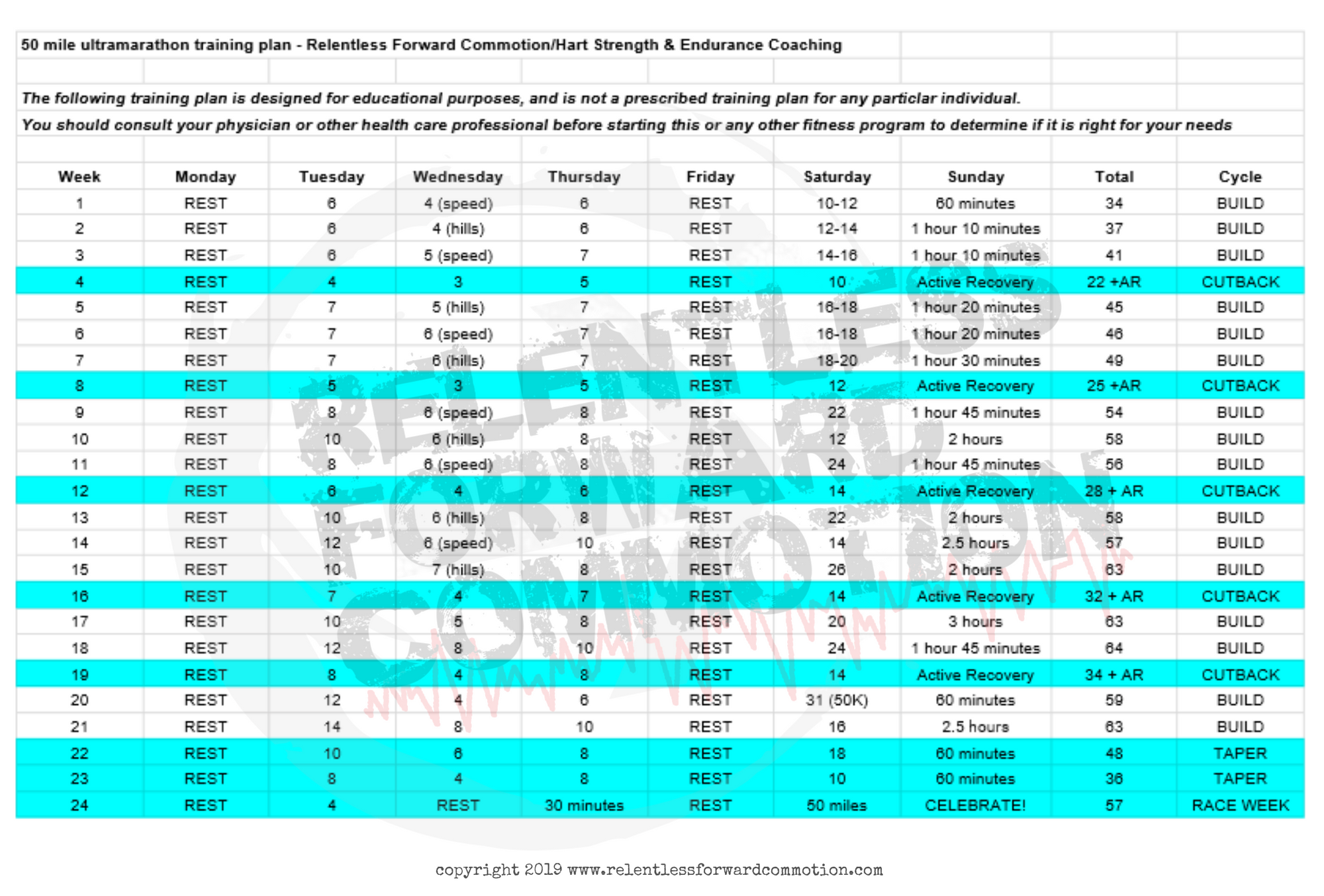 I'm using her 50 mile training plan as the basis for my own, which looks like this: