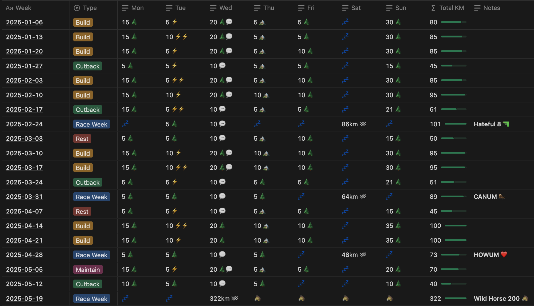 Realistically the weekly volume will likely drop as fatigue (and life!) set in, so I'm seeing this more as an ideal goal and won't beat myself up if I don't quite hit it.