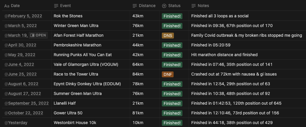 However it's also the year that running became more of an unhealthy obsession, a commitment that started to negatively impact the rest of my life and something that, on reflection, I'd need to greatly improve going into 2023.